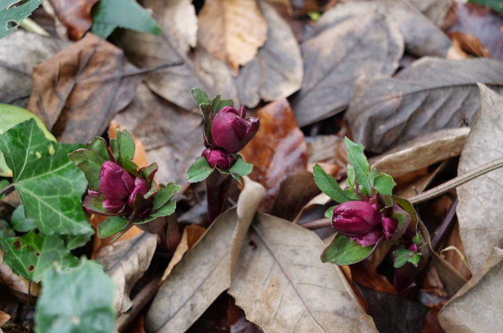 Hier zeigen die meisten Lenzrosen ihre Blütenstände, fast alle noch knospig. Diese hier ist am weitesten... Im Winter 2023/2024 gepflanzt, hat sie sich schön entwickelt: