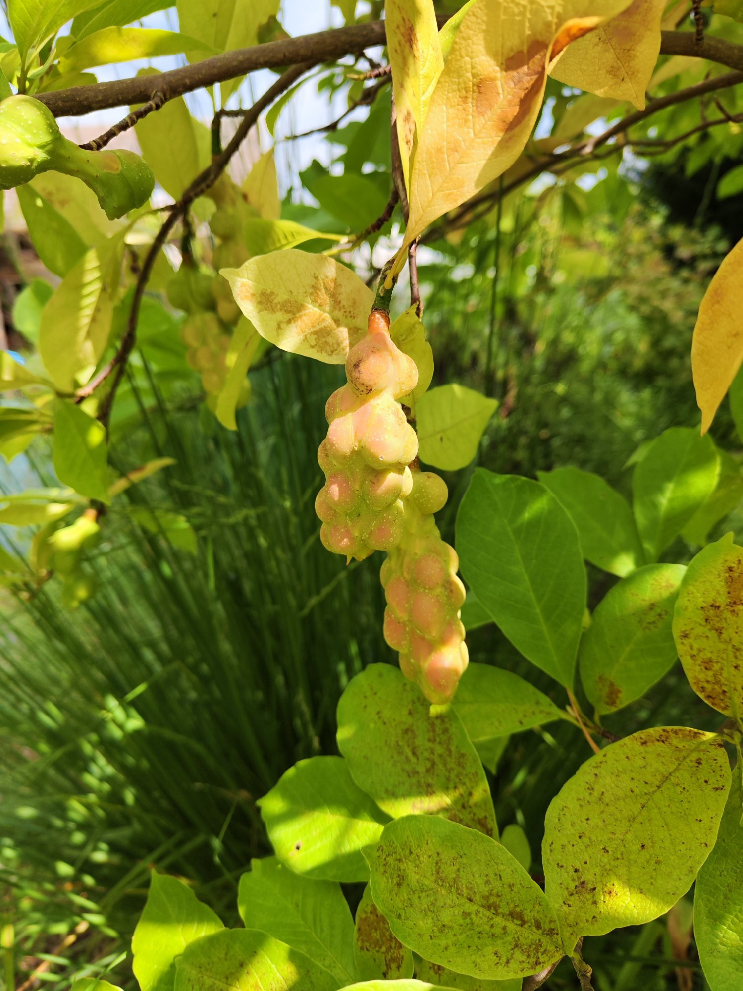 Magnolia kobus, ein Abkömmling aus Saxdorf, fruchtet das erste Mal.