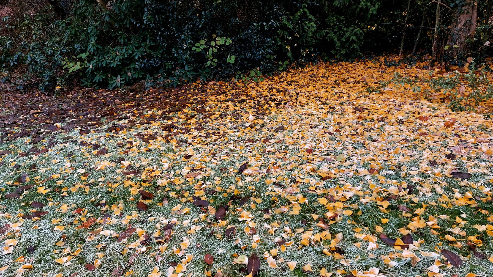 Eindrücke zwischen Herbst und Winter : was von den Herbstanemonen übrig ist, Herbstlaub von Gingko und Walnuß, erster Raureif und