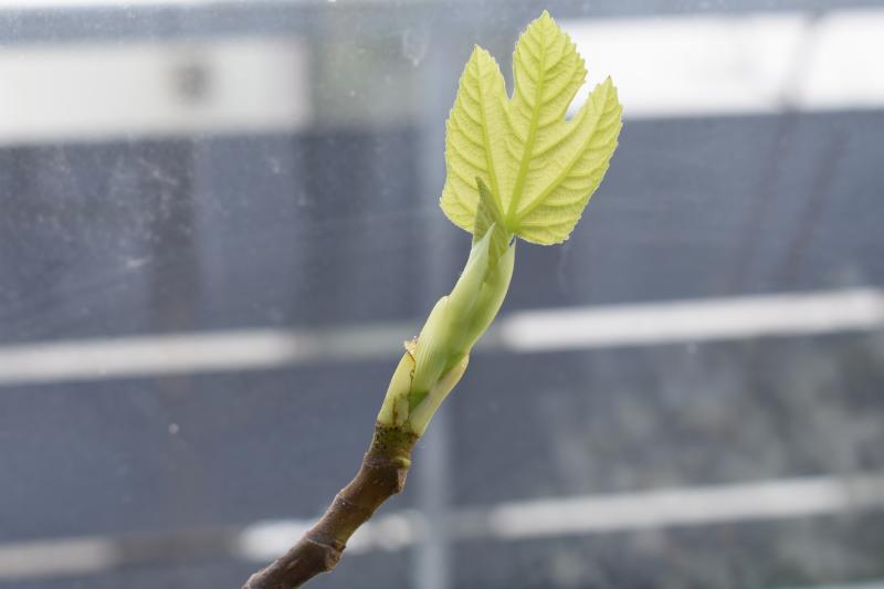 Die kleine Feige ist vom letzten Jahr und hat jetzt neu ausgetrieben, sie hatte letztes Jahr schon viele Blätter.