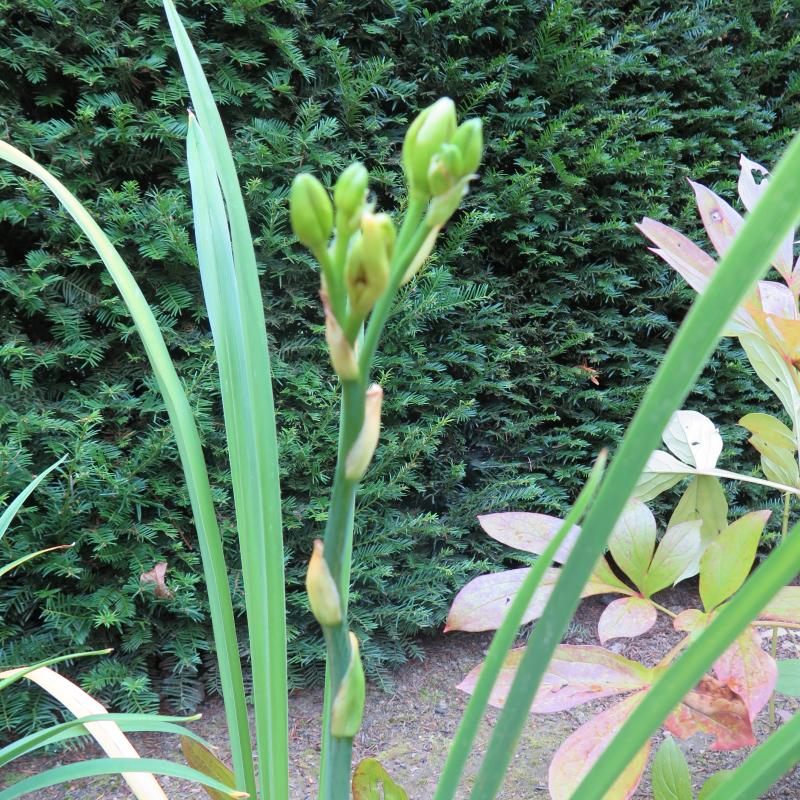Noch Stiele haben hier in den letzten Wochen Euro-mazing, Heavenly White Swan und Dream Maker geschoben.Diese Pflanzen haben alle regulär in diesem Jahr bereits geblüht. Aber - sie strengen sich in dieser Jahreszeit hier umsonst an. Bei dem Foto von Euro-mazing könnt ihr trotz der undeutlichen Aufnahme sehen, dass die vordere Knospe zudem "taub" ist. Der Stiel hat sich während meiner Urlaubszeit unbemerkt hochgedrückt und wird abgeschnitten, um die Pflanze nicht unnötig vor dem Winter zu schwächen.