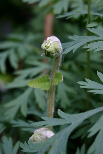 Einen schönen Austrieb hatte auch der mittlerweile voll entwickelte Osmunda claytoniana ,hier ragt er vorwitzig aus Dicentra exima hervor.