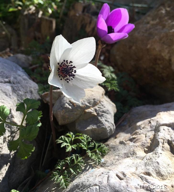 Eine zarte niedrige Form der Anemone coronaria aus dem Iran blüht hier gerade.
