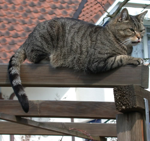Das mit dem Klettern trifft zu, ich hoffe nur, sie verlegt ihre Übungen in einen anderen Garten.Das sieht nach einem Abessinier aus. Sehr eindrucksvoll!