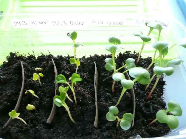 ... die letzte Reihe (links) gibt Gas, das Bild stammt von gestern, 27.03. 7 Uhr, am schnellsten gekeimt hat mit nur 3 Tagen in der Reihe vom 20.03. das dritte Radieschen von vorne
