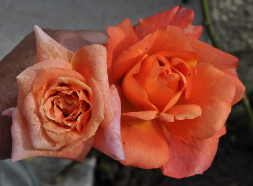 Dann ein Experiment für Carabea, hier die beiden Reine de Violettes.Links auf dem Bild die aus dem Garten, rechts die im Topf. Schon ein farblicher Unterschied.