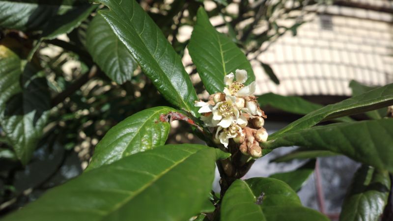 Eriobotrya japonica blüht jetzt zum ersten Mal .Seit ca 16 Jahren an der Südseite des Hauses ausgepflanzt und ca.6 m hoch. Die letzten Wespen umschwirren die Blüten.
