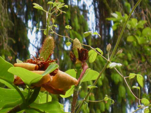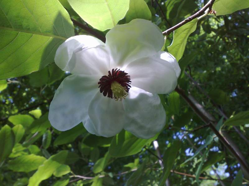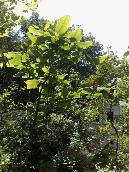 Liriodendron chinense blüht bei mir nach 20 Jahren zum erstenmal.Leider sind die Blüten in 7 bis 10m Höhe und mein Nokia95 Zoom ist genauso überfordert wie meine 4m Teleskopastschere.Ich muß alle Bäume unten auskahlen wegen der Unterpflanzung.Im Gegensatz zum Liriodendron tulipifera sind die Blüten gänzlich braun-orange,etwas kleiner und weiter geöffnet wie mein Fernglas mir zeigt.Wegen der Farbe der Blüte das leider unscharfe Photo.Blüte rot umrandet.