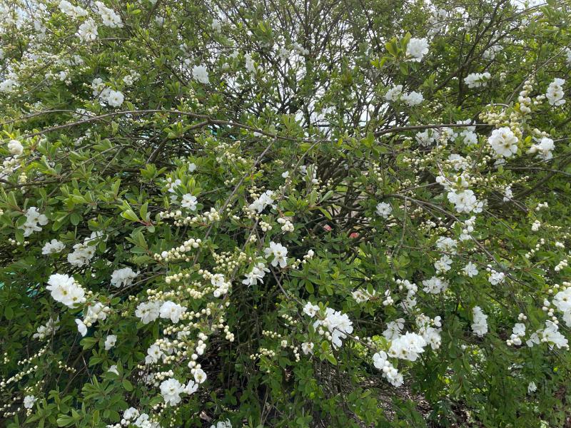 Unbeeindruckt von dem Spätfrost ist Exochorda macrantha 'The Bride' (mittlerweile 2.50 Meter hoch)