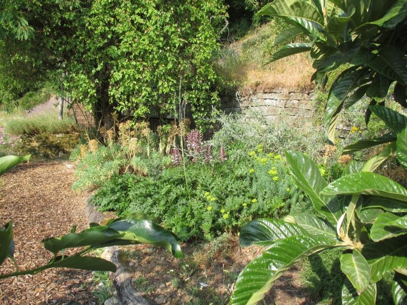 Ein nunmehr schmaler Pfad führt zwischen Cistus florentinus und Phillyrea angustifolia hindurch. Im Hintergrund leuchtet eine Cistrose mit geb-panaschiertem Blatt unter der Schmalblättrigen Ölweide.