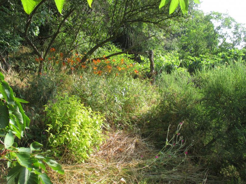 Ich mache da nicht viel, reiße die Brombeeren und Rosensämlinge raus und halte den Blutstorchschnabel zurück.