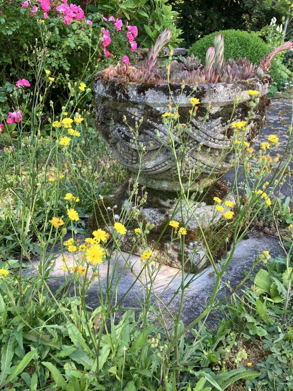 Lege an die Hydrangea an. Zugabe Rose, Buchs, Hauswurztopf in gelbem Wildkraut.