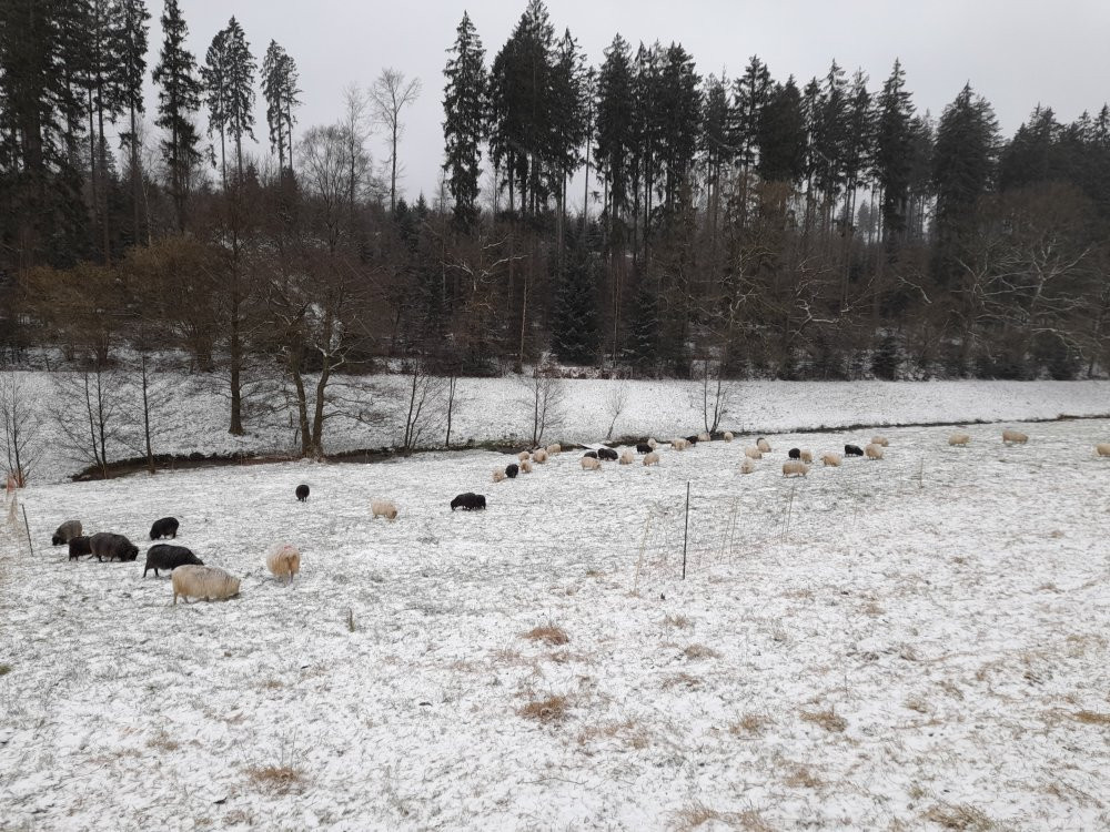 Ist aber dennoch alles etwas pervertiert, weil wir schon den erhobenen Zeigefinger bekamen, weil die Schafe jaauch in Wildschweinschäden liegen könnten und so kein Umsatz erfolgen würde. Das ist angesichts der braunen Flächen hier unterm Schnee - auch mit Wildschweinschäden - echt vernachlässigbar