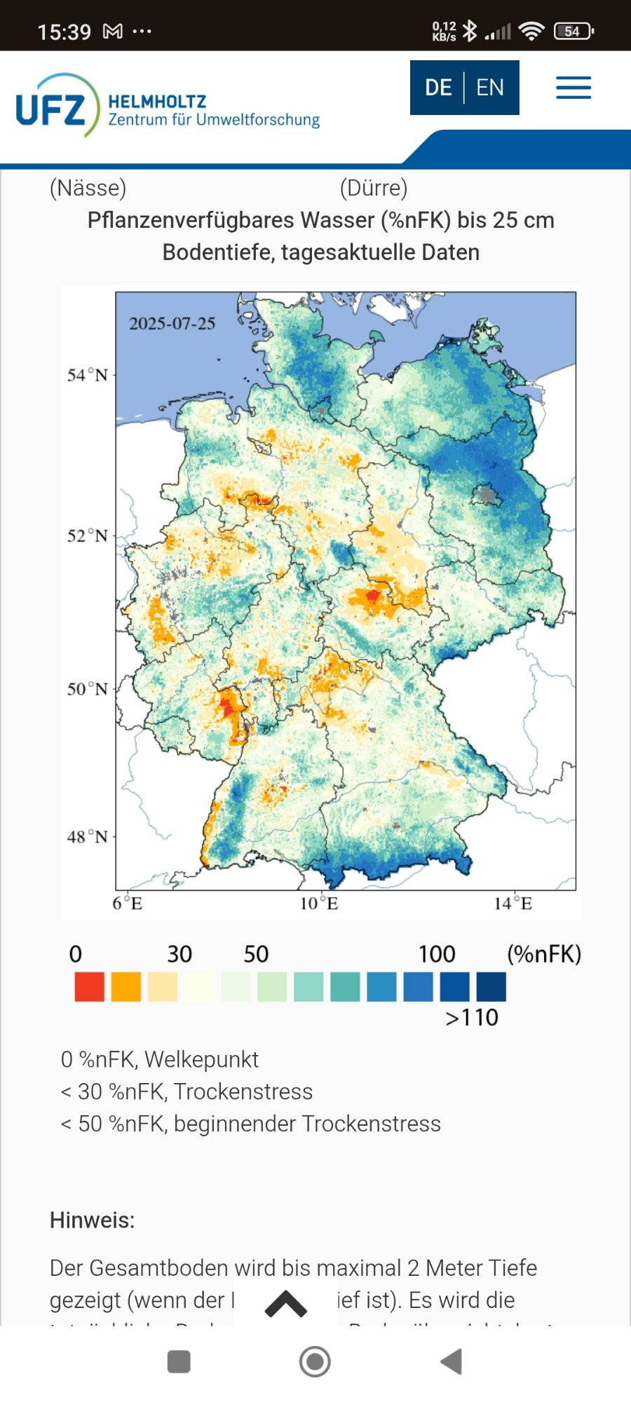 In der einen Hälfte des Vorgartens steht unter einem Ahorn ziemlich schattig ein Zwergflieder und der ist mein Dürreindikator. Das blöde Gewächs hat's in sicher 10 Jahren nicht bis in dauerfeuchte Schichten geschafft und schlappt im Sommer häufig.