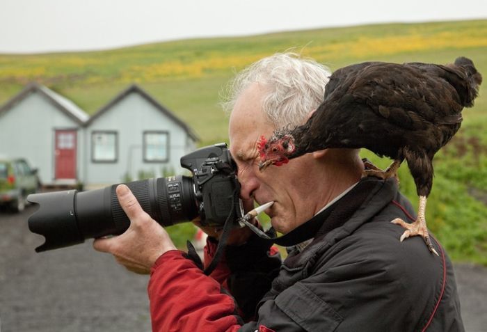 Der Hahn ist ja auf dem rechten Bild beim Krähen so toll eingefangen. Er sieht "gaanz wichtig" aus. Allerdings weiß er nicht, daß er andererseits auch furchtbar komisch ist. Auf dem linken Foto sieht man nämlich, daß er eine braune Latzhose trägt.![]()