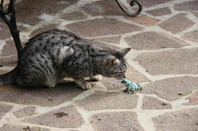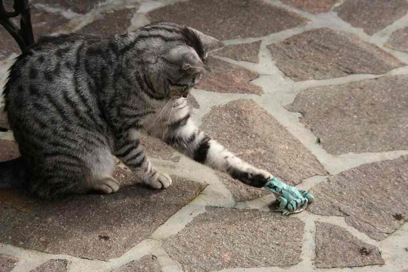 Hallo !Der Frosch ist aus Plastik, aber so lebensecht. Habe ihn mal in einer Schule gekauft. Den hat mein Enkel und ich gekauft um die andere Oma zu erschrecken. Sie hat Angst vor Fröschen. Wir beide haben uns schon ausgemalt, wenn Oma den Frosch sieht das sie dann gleich vor Schreck schreit. Sie kam dann mal unverhofft, da hat Lukas den Frosch schnell von mir geholt und ihn aufs Fensterbrett gesetzt. Sie hat sich richtig erschrocken......gemein nicht wahr ? Ich habe da so eine Wasserschale die man auf so einen Stock setzen kann, da sitzt der Frosch immer drauf. Da habe ich den mal sauber gemacht und habe ihn vor Seppi hingesetzt. Der hat ihn sich genau betrachtet ob der fressbar ist