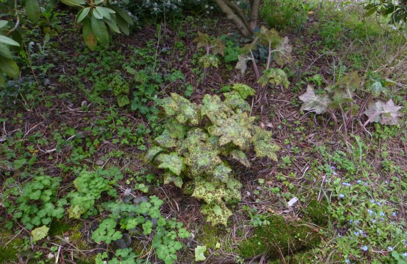 Dieses Jahr bin ich mit den hübschen Fußblättern bis auf eine Ausnahme (D 106 ist ex) sehr zufrieden.Sämtliche P. peltatum werden wohl blühen - ich müsste die Dinger dringend vereinzeln.Podophyllum peltatum f. deamii - kommt heuer mit 4 Trieben, alle mit BlütenknospePodophyllum peltatum 'Missouri May' - Neuzugang vom letzten Jahr, da sehe ich bislang 1 kräftigen Trieb, ob mit oder ohne Knospe ist noch nicht zu sehenPodophyllum delavayi - 2 Blätter, scheinen schön gezeichnet zu sein, 1 KnospePodophyllum 'Spotty Dotty' - etwa das Format von Pearls Schätzchen, ist am weitesten, reichlich Knospen unter den Blättern, auf Entfernung aber nicht mehr fotografierbar für mich. Podophyllum aurantiocaule aurantiocaule - als einzige noch nicht sichtbar, kommt aber immer als letztePodophyllum mairei - platzt aus allen Nähten vor lauter Knospen