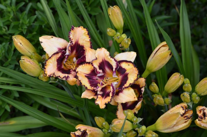 Von mir gibt es Sweet Temptation - mit folgendem Hintergrund:Ihr könnt vorne rechts im Foto ein gespaltenes Taglilienblatt sehen.Uns hat hier insgesamt drei Mal Hagel, einmal davon extrem schwer, getroffen. Wer das schon mal hatte, dem brauche ich nix erzählen...Was nun vielleicht anderen weiter hilft: Manche Blätter habe ich abgeschnitten, weil sie so zerfetzt waren. Wenn es aber ein "normaler" Hagelschaden, also das Aufsplitten der Blätter (wie auf dem Foto) ist: Die habe ich drangelassen. Es entsteht um die Schnittkanten nur ein ganz schmaler brauner "Wundrand", sieht man kaum und die Pflanze behält ihren normalen Habitus. Durch den üppigen Regen sind viele Blattschäden mittlerweile überwachsen - nun könnte man immer noch Blätter rausziehen.Außerdem sind die Taglilien regenbedingt zwar gewachsen, doch brechen wie Glas. Um nicht noch mehr Stiele zu verlieren, halte ich mich also zurück...