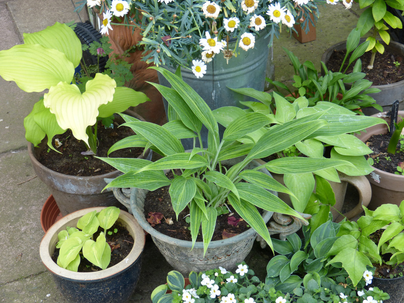 Heute war ich auch kurz im Garten, um einige Hostas zu teilen. Dabei habe ich gesehen, dass die schon ziemlich große 'Albopicta' (sie wächst ja so schnell) jetzt in den letzten Tagen nach dem Unwetter auch sehr von den Schnecken heimgesucht wurde. Vorher bei der wochenlangen Trockenheit gab es hier keine Probleme mit Schneckenfraß. Andere Hostas mit festerem Laub wurden jedoch nicht angefressen. Ein Teilstück habe ich nun auch getopft und den freigewordenen Platz im Beet bekommt dann ein Teilstück von Violetta, die bisher getopft war. Die 'Albopicta' ist ja eigentlich nur im Austrieb sehr schön und später dann eher unauffällig.