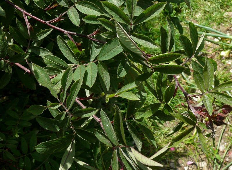 Hier ein aktuelles Bild meiner Rose, die aus einer Kreuzung von ´Rotes Phaenomen´ und R. foliolosa entstand. Sie hat als Erbe der Vaterpflanze zartere Triebe und zierlicheres Laub als RPh; das rot durchgefärbte Holz und das rot überhauchte Laub hat sie von RPh geerbt.