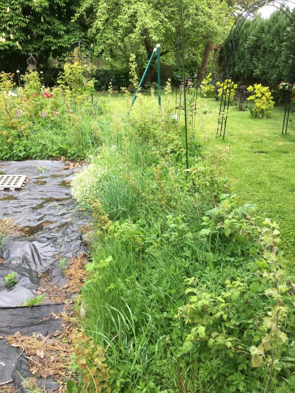 Etwas näher ran an die „Umrandung“, Himbeerhecke, stark verunkrautet :o, kommt weg und wird durch eine Strauch- oder hohe Gräser-Abgrenzung (Wind-und Sichtschutz) ersetzt