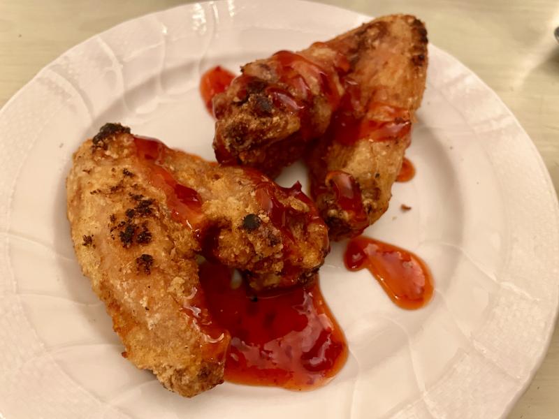 gestern gab es bei uns höchst ungesundes in anlehnung an ein unterhaltsames double fried korean chicken-rezept, allerdings ohne die typische koreanische würzsoße, zur beschleunigung und gg-seitig erwünschten würzreduzierung gab es süße chilisoße aus der flasche.