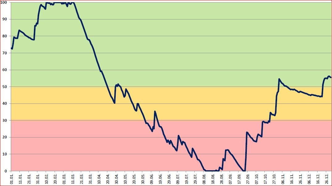 Ok, das ändert einiges. Das ist nicht die Dürre im Dürremonitor, sondern die nutzbare Feldkapazität. Die liegt hier zwischen 20 und 30%, je nach Bodenart, unterhalb 50 ist Trockenstress.