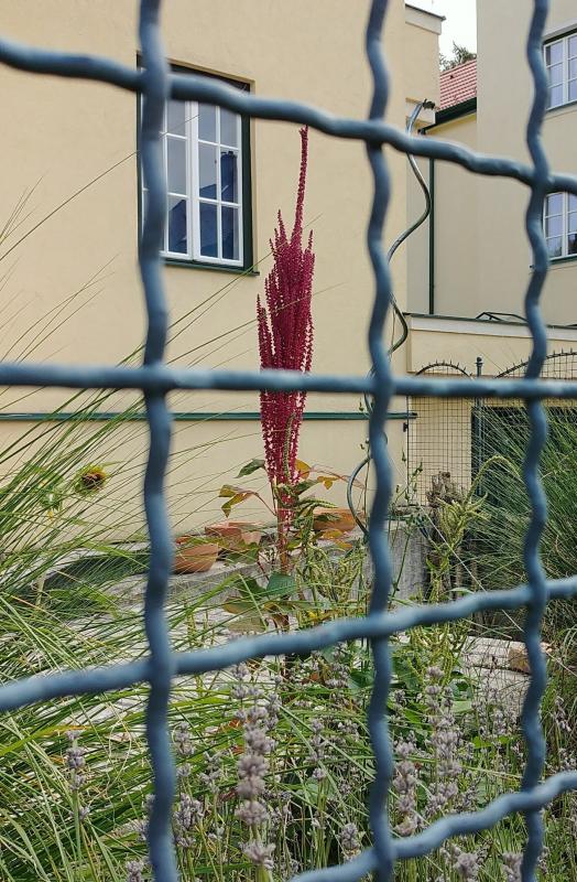 ich habe am 28. August des Vorjahres diese mir unbekannte Pflanze in einem Garten ein paar Gassen weiter fotografiert. Leider habe ich kein anderes Bild, ich hoffe die Qualität ist ausreichend.