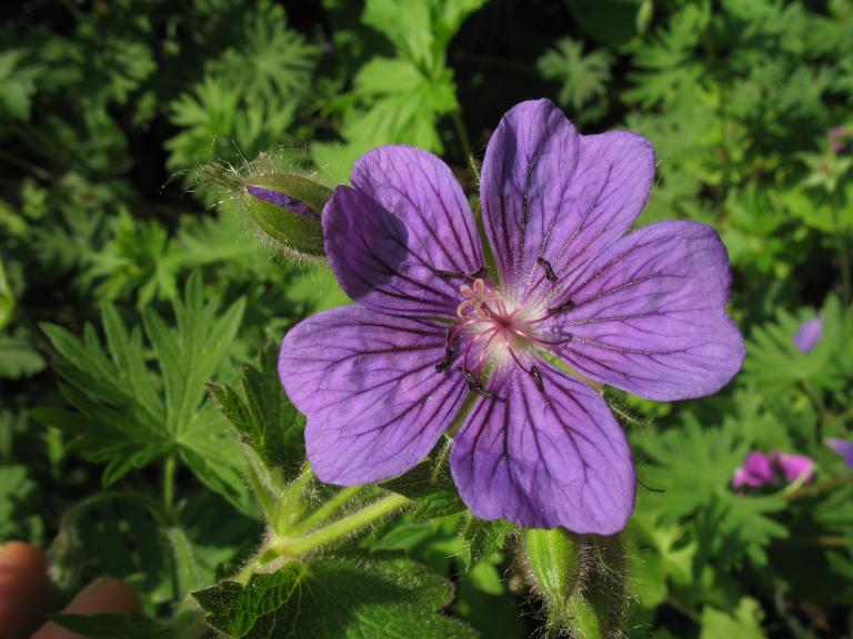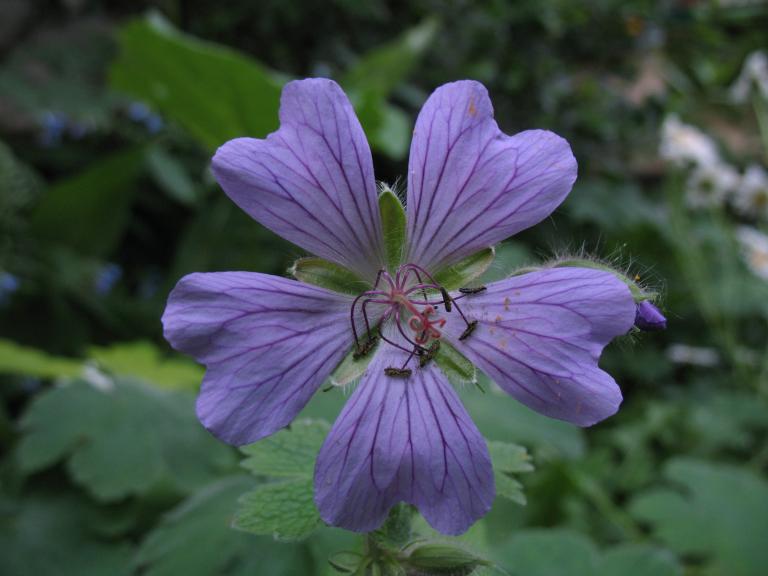 Ich denke, ohne dass ich es sicher weiss, dass sich nach Abmähen bei fast allen Arten neue Blätter bilden dürften, sofern man früh genug und nicht etwa erst im Spätsommer mäht/schneidet. Mit Ausnahme der einjährigen Arten natürlich. Und: Vielleicht reagieren Geranium-Arten aus Regionen mit sommerlicher Ruhezeit (Trockenzeit)anders und treiben nicht wieder aus. Könnte ich mir gut vorstellen. G. peloponnesiacum (der auch in G. 'Stephanie' eingekreuzt ist) aus der G. renardii/ibericum-Verwandschaft, soll z. B. eine sommerliche Ruhezeit durchmachen.Hier ein vermutlicher Sämling von 'Philippe Vapelle', der bei mir zum ersten Mal blüht. Deutlich dunklere Blüten als 'Philippe Vapelle' und größer: ca. 5 cm im Dm (Philippe Vap hat nur 4 cm). Leider ist die Blütenstruktur etwas schlapper, wie man auf dem Foto ja sehen kann.