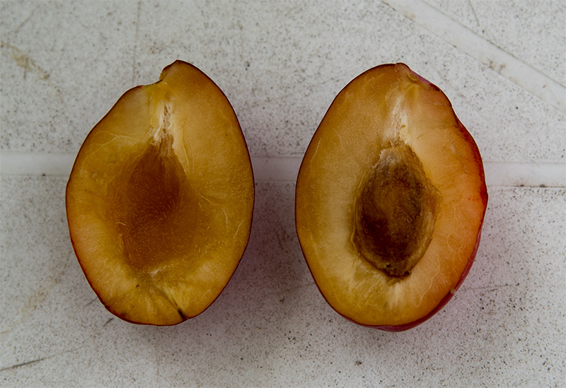 Die ovale Form spricht auch für Pflaume. Mirabellen haben keine so ausgeprägte Bauchnaht.