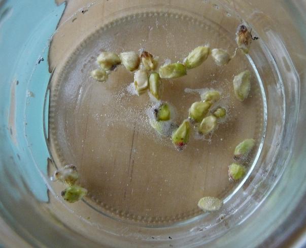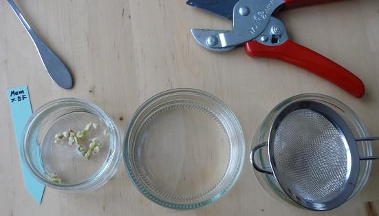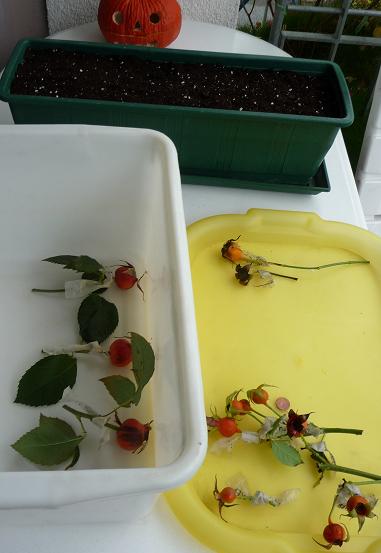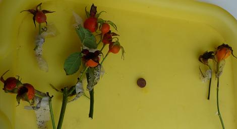 also 1. Schildchen schreiben2. aufmachen (mit Schere Stück für Stück abgeschnitten bzw. aufgebrochen)3. grob von Hand gereinigt, Fruchfleisch so gut wie möglich entfernt.4. in Wasserstoffperoxid-Lösung tun, 3%ig, gibt es so in Apotheke.5. wässern6. trocknenund immer alles Hagebuttenweise, damit bloß nix durcheinanderkommt.
