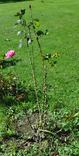 Caprice de Meilland.Im Frühling bodeneben abgeschnitten, dannach bildete sie Raketentriebe bis gegen 1,5 m lange Triebe, die beim kleinsten Windstoss laufend abbrachen. (Der Boden ist auf dem Bild noch unbearbeitet, aber einen Teller haben alle Rosen. Wobei das Gras fast schneller in den Teller wächst als man zugucken kann.