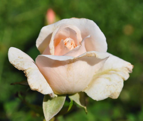 Ein Winzsträuchlein von gegen 60 cm.Ursprünglich als rankende 4 m Rose am Eingang zu diesem Rosengarten gedacht.Gegenüber stand Meg, (für 3 m) die sich zusammen oben über dem Bogen hätten treffen sollen. Meg ist gestorben, sie brachte es immerhin mal in der Glanzzeit auf 1,8 m Höhe, wie auch Penny Lane. Danach gings nur noch rückwärts.