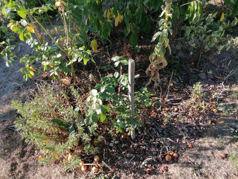 Das Beet ist völlig verdorrt, man sieht auf 1 Uhr eine kaum kniehohe eingerollte Lespedeza thunbergii und auf etwa 3 Uhr eine total vertrocknete Aster dumosus, die ich mal schön fand und vom Friedhofskompost gerettet habe ::)