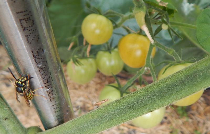 Wie jedes Jahr , quartieren sich die Gemüseeulen in den geschützt stehenden Tomaten ein.Von den Dreien haben sich zwei die Feldwespen geholt.Eine Nimmersatt wurde "umgesiedelt".