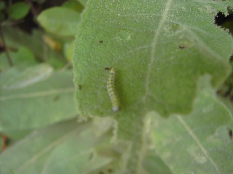 Ich fand sie gestern zu Mehreren auf den Blättern zweier Verbascum, sie hatten in kurzer Zeit schon ordentliche Löcher reingefressen. Die Raupen waren noch klein, weniger als 2 cm groß und auch recht dünn. Sorry für das schlechte Foto, ich habe es trotz mehrerer Versuche nicht besser hinbekommen. Ich hoffe, man kann genug erkennen.