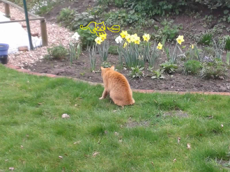 Gleich hinter den Osterglocken, links