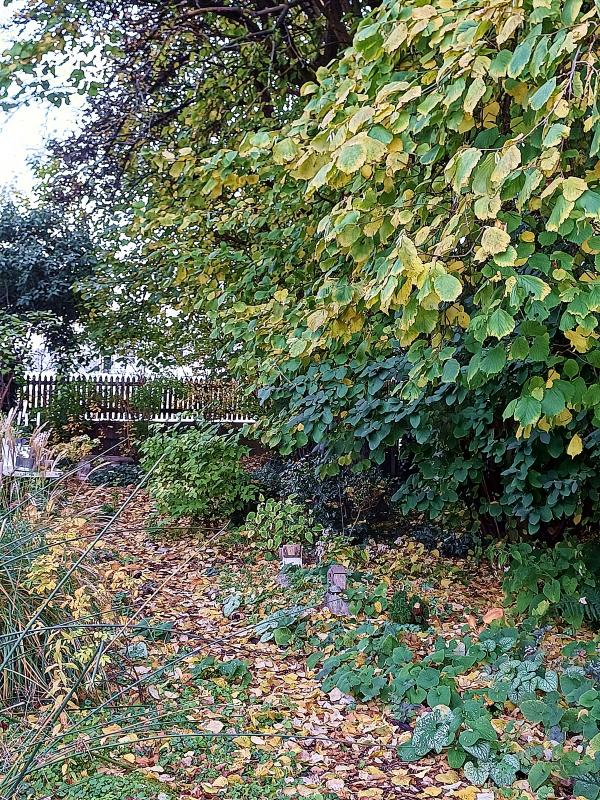 Die reichen Regenfälle haben auch dafür gesorgt, dass der Goldfelberich nach der Blüte nicht verdorrt und unansehnlich wird. Ansonsten schneide ich den meist ziemlich zeitig ab, umbringen kann ihn ja sowieso nichts, aber so eine leuchtende Herbstfärbung ist eine nette Überraschung, und auch hier wieder ein schöner Kontrast zur blauen Bank auf der Terrasse. Auch die Wurmfarne sind dieses Jahr richtig üppig, das Moos auf der Treppe ist sattgrün, und das gelbe Laub der Haseln tupft überall leuchtende Flecke in die Schattenbeete.