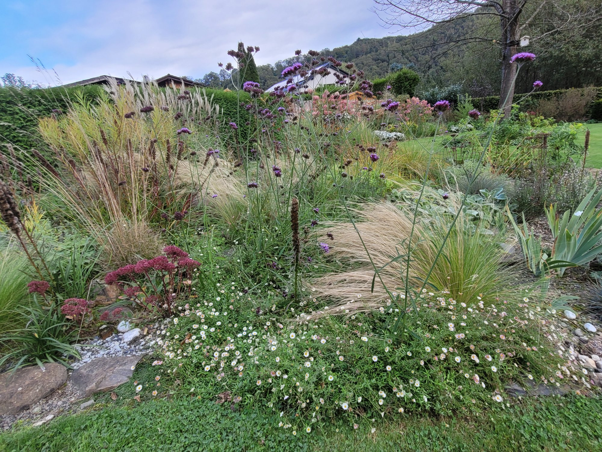 Pennisetum orientale 'Karley Rose' und auch Stipa Gigantea und Stipa tenuissima gedeihen hier im Lehmboden mit leichter Sand- Kiesauflage super in der vollen Sonne.