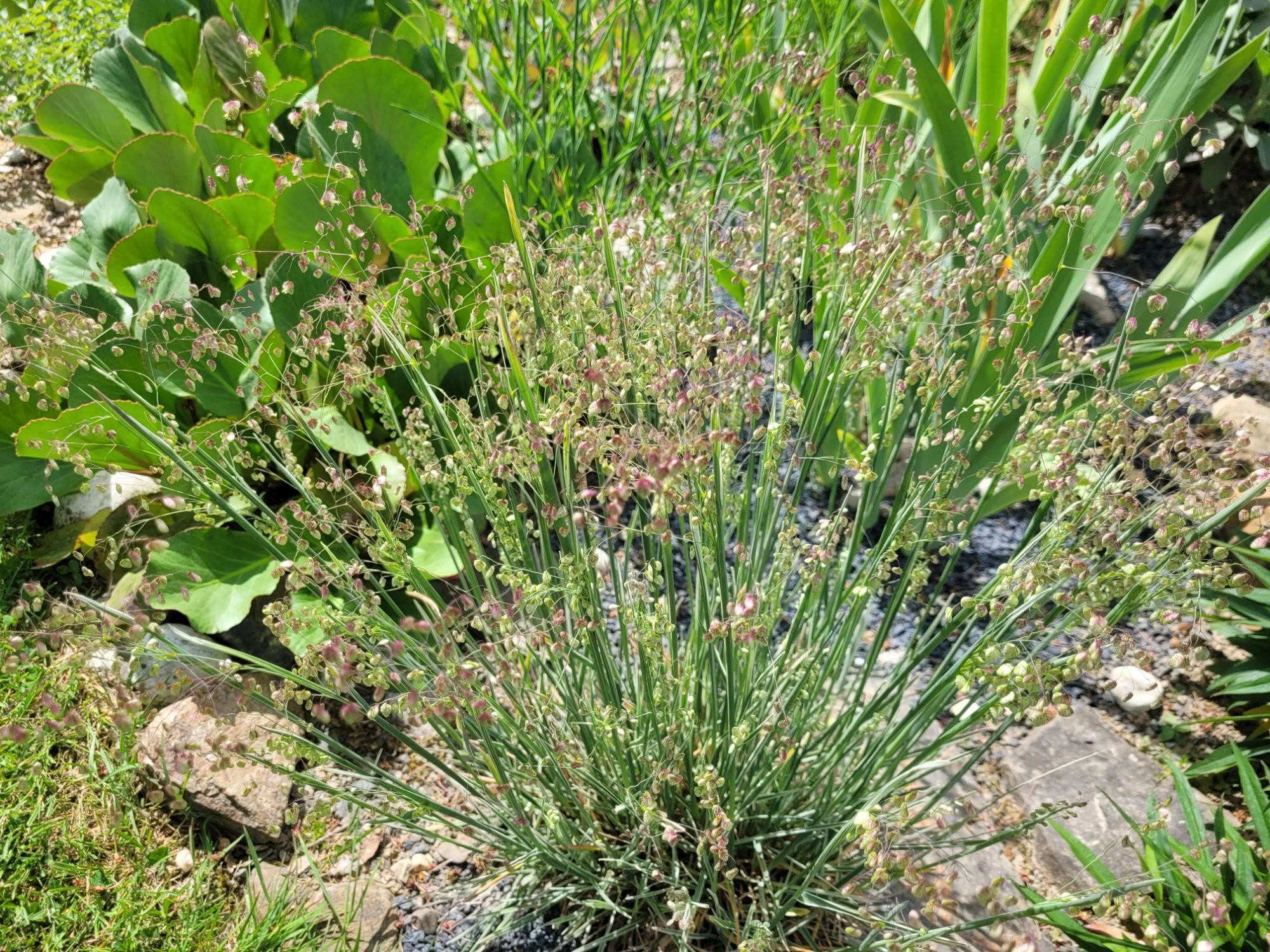 Hier steht Briza media 'Zitterzebra' nun voll in Blüte. Das Fotografieren ist bei Sonnenschein und heftigem Wind schwierig, aber ich gabe es versucht. Ein niedliches Gras, das ständig in Bewegung ist... und sich hier aus einem einzigen (mitgenommenen