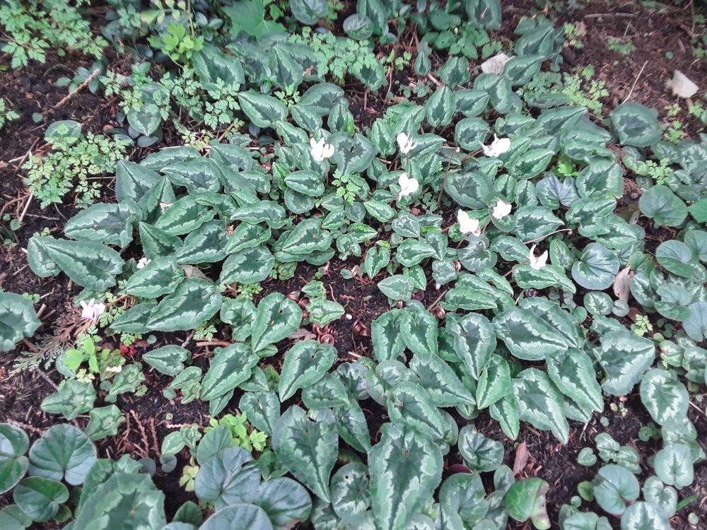 Ich habe mir nämlich zuerst Cyclamen von Schoebel bestellt, nicht vor Ort ausgesucht, wohlgemerkt und sah dann in der Gärtnerei 50 Stück 'Perlenteppich'. Das war ein Anblick! Was für ein wunderschönes Laub! Und dann die weißen makellosen Blüten!