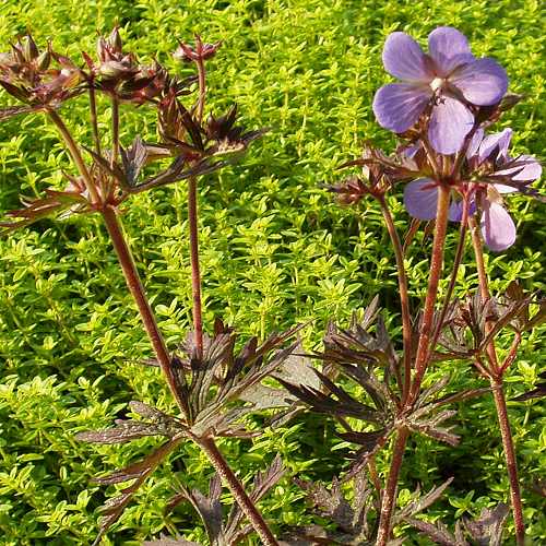 Die finde ich sehr hübsch: Geranium pratense Midnight Rider,ein rotblättriger Storchschnabel