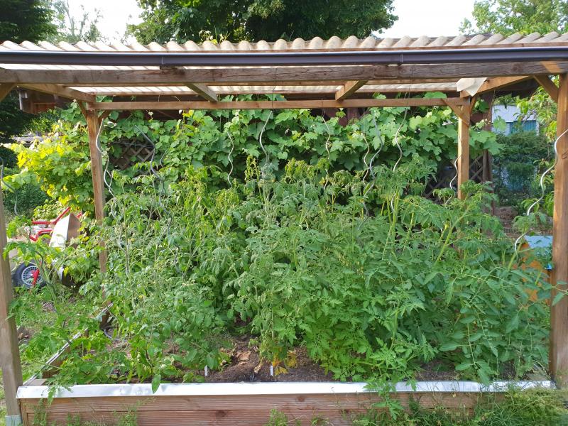 Wir haben das Tomatendach aus dem alten Garten umgezogen. Unten hat es eine niedrige Seitenwand mit Schneckenzaun. So kann ich Salat und Basilikum unter den Tomaten kultivieren. Da ich mehrtriebig ziehe, wird allerdings langsam der Luftraum knapp. Den letzten Salat habe ich gestern geerntet, er war schon ordentlich gestreckt. Als nächstes lichte ich unten die Blätter aus und binde Schnüre vom Dach zu den großen Seitentrieben. Und geize alles aus, was ich im Dschungel noch finde...