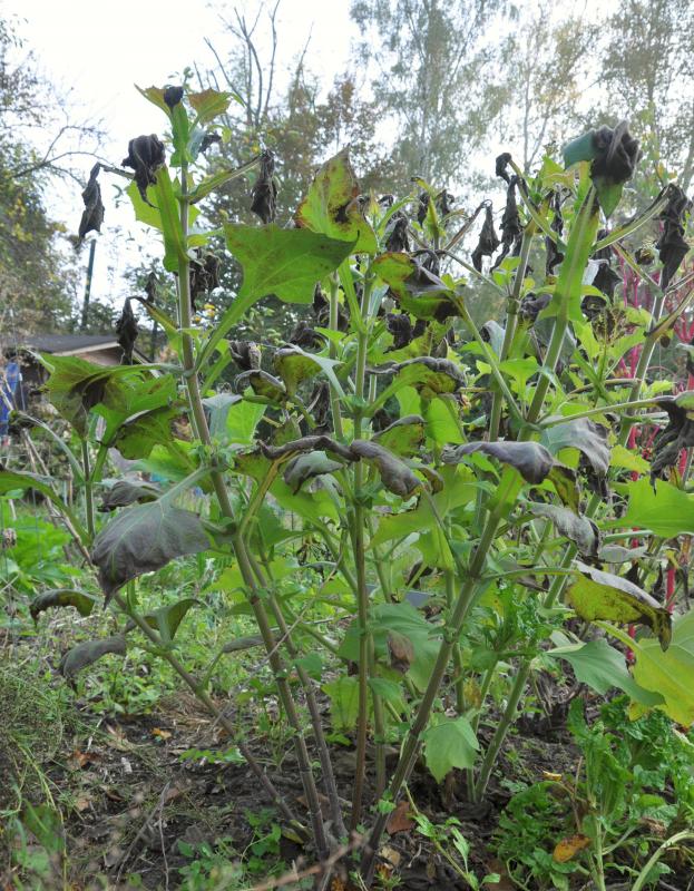 Auch meine Yakonpflanzen treiben nach einer Frostnacht von unten wieder aus. Nun soll es ja nächste Woche hier nachts wieder Frost geben und ich beginne mal langsam mit der Ernte, damit die geernteten Knollen noch gut abtrocknen können. Im Dürresommer 18 hatte ich ja eine gute Ernte, die ich nie erwartet hätte. Dieses Jahr sind einige Pflanzen nicht so hochgewachsen, andere über 1,70m. Hier eine Sorte,die ausSaatgut gezogen wurde...