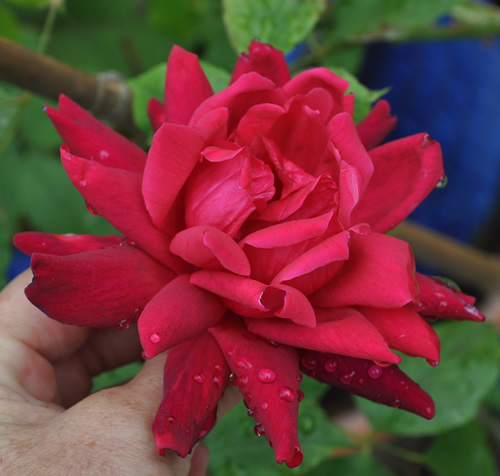 Bei der Farbbeschreibung hat wohl wer mächtig Hunger auf Crevetten gehabtBundesrat Häberlin hatte in Sangerhausen eine absolut interessante Farbe, die im Katalog von Soupert & Notting passend mit "crevettenrosa" beschrieben wurde. Ich habe sie nach Luxemburg in eine Sammlung und dort hat sie eine ganz andere Farbe bekommen, ein tiefes leuchtendes, fast transparentes Rotweinrot- ob das durch den Boden oder das Klima bedingt ist? Nächstes Jahr bekomme ich eine veredelte Rose zurück, die im warmen Rheintal zeigen muß, ob sie tatsächlich so variabel ist.
