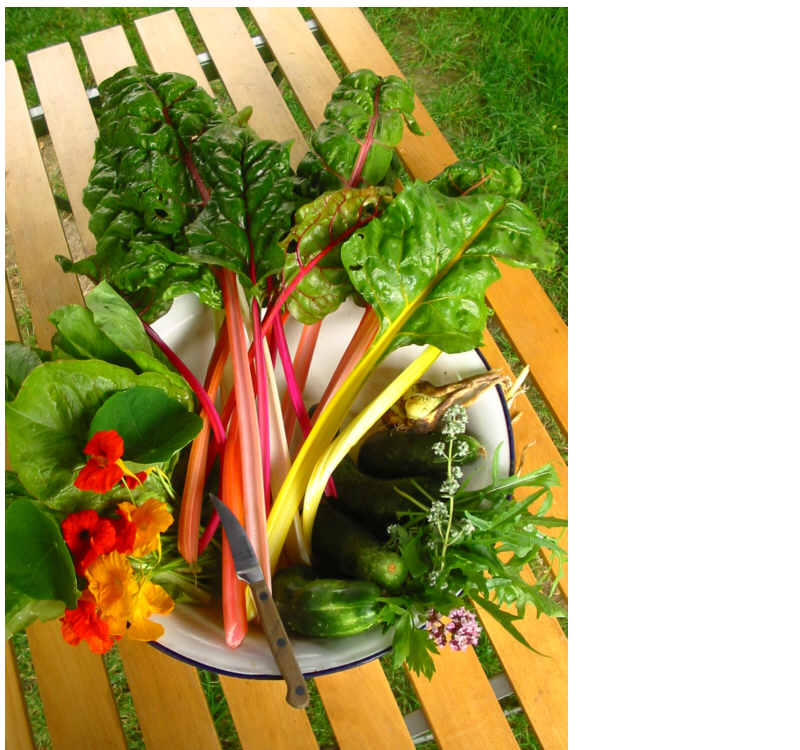 Geschossener Salat, Mangold, Einlegegurken, Himbeeren und Salatkräuter
