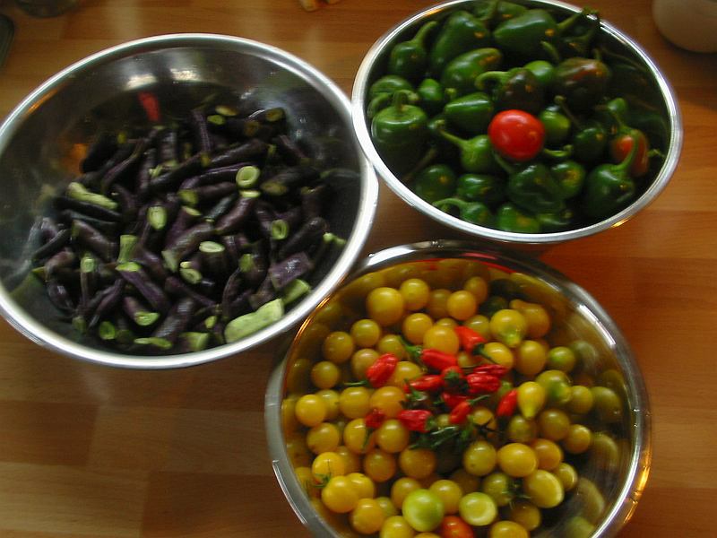 Oh, Holundergelee! Morgen bekomme ich ein Glas von meiner Freundin, die hat letzte Woche gesaftet und Gelee gekocht, meine Beeren hängen noch.Heute noch 4 Salatgurken aus dem Freiland, Rockenbollen-Zwiebelchen, Radieschen, Salat und das hier: Blauhilde-Stangenbohnen, scharfe Glockenpaprika, Chilies und Wildtomaten.