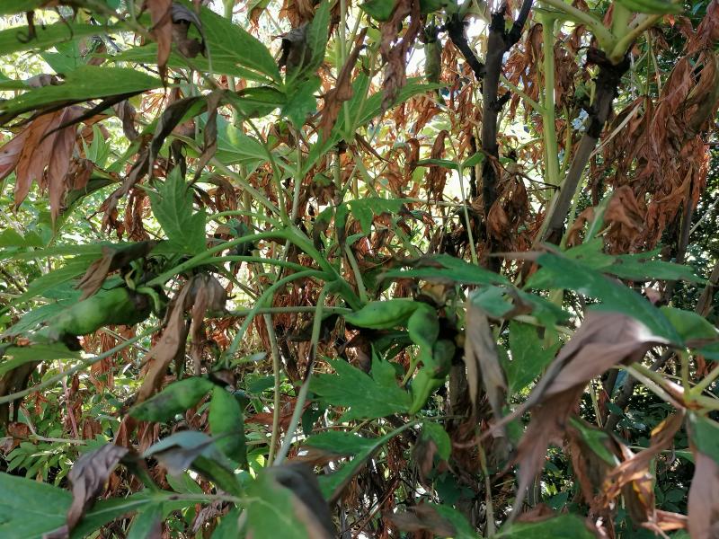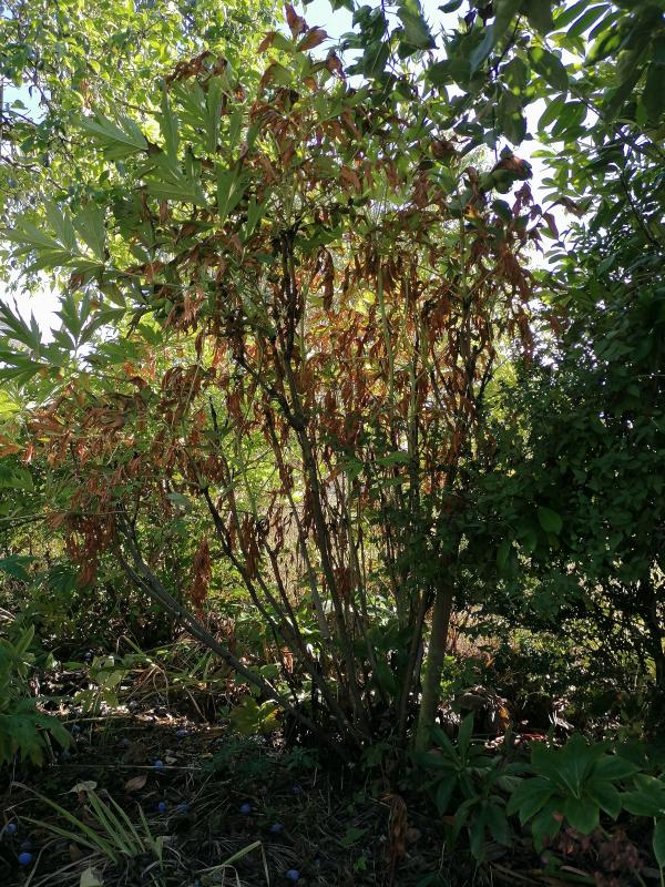 Paeonia ludlowii. Sehr gebeutelt, der ausgewachsene Strauch ist knapp 3 m hoch und war etwa zur Hälfte dürr im Laub. Aber das grün hat wohl gewonnen