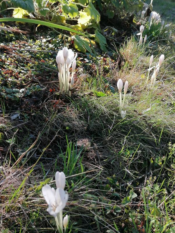 Die gehören auf jeden Fall auch zu den Trockenkünstlern: Colchicum autumnale "Album" spriessen aus der Erde. Dazwischen auch schon einzelne grüne Grashalme.