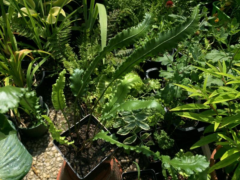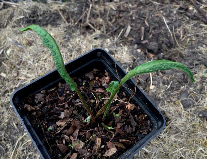 das war der topf, bei dem ich von mehreren sporlingen ausging, beim versuchten teilen zeigte sich aber, dass das alles an einem rhizomstock sprießt – bzw. spross, ein teil habe ich beim versuch, die vermeintlichen sporlinge zu trennen, davon abgerissen und nun extra getopft... mal sehen, ob das gut geht, das ganze teil war eh schon frisch getopft und einigermaßen wurzelfrei... :-\